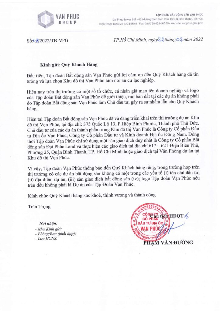Van Phuc Group xin trân trọng thông báo