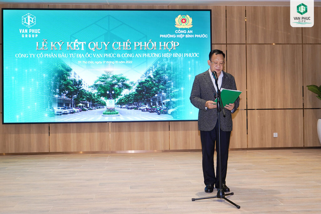 Ngày 17/10/2022, dưới sự chứng kiến của lãnh đạo Đảng ủy và UBND P.Hiệp Bình Phước, Van Phuc Group và Công an P.Hiệp Bình Phước đã ký kết Quy chế Phối hợp trong công tác đảm bảo tình hình an ninh chính trị và trật tự an toàn xã hội tại Khu đô thị Vạn Phúc.