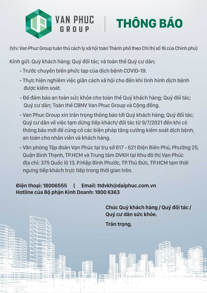 Vạn Phúc Group tuân thủ cách ly xã hội theo chỉ thị số 16 của chính phủ Đăng vào 23/07/202103/08/2022 bởi admin 5/5 - (1 bình chọn) Vạn Phúc City nhận giải thưởng dự án đáng sống 2021 Vạn Phúc Group tặng 26 máy thở cho các bệnh viện tại TP. Thủ Đức